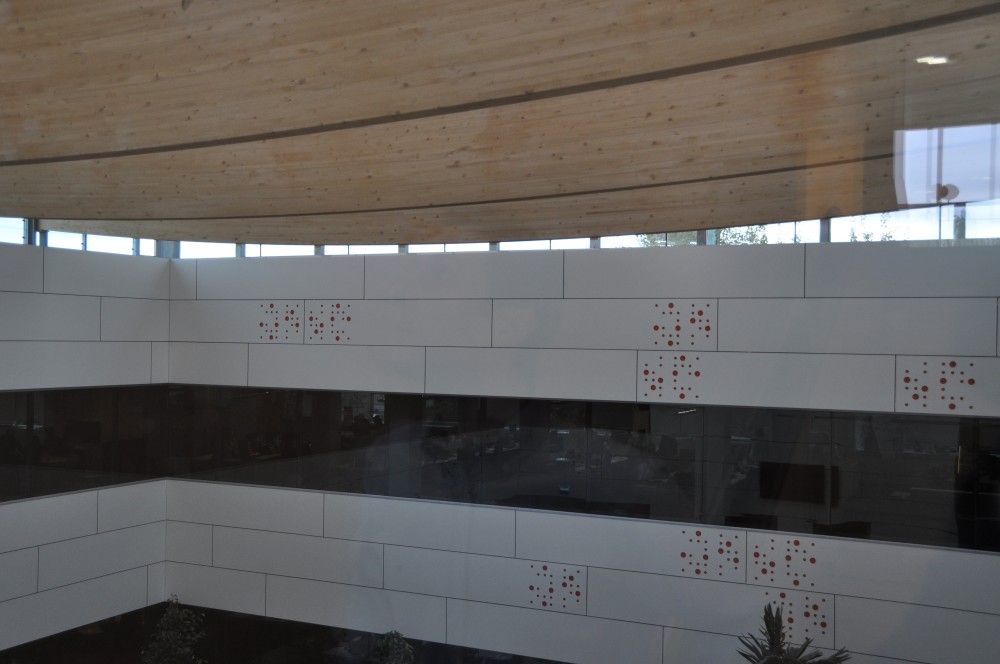 - Sustitución de un lucernario de cubrición de patio traslúcido, de bóvedas de policarbonato por otra cubierta formada por una lámina de módulos fotovoltaicos transparentes colocados en horizontal. Esta solución permite el paso de luz natural al patio a la vez que se genera energía limpia. Se sustituye la antigua estructura metálica de la cubierta por otra de madera laminada vista que aporta un aspecto de mayor calidez, teniendo en cuenta que el patio aloja un jardín interior.