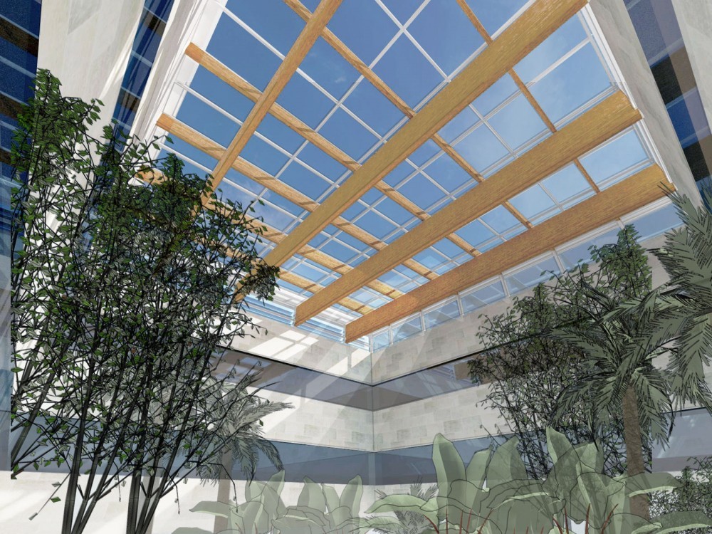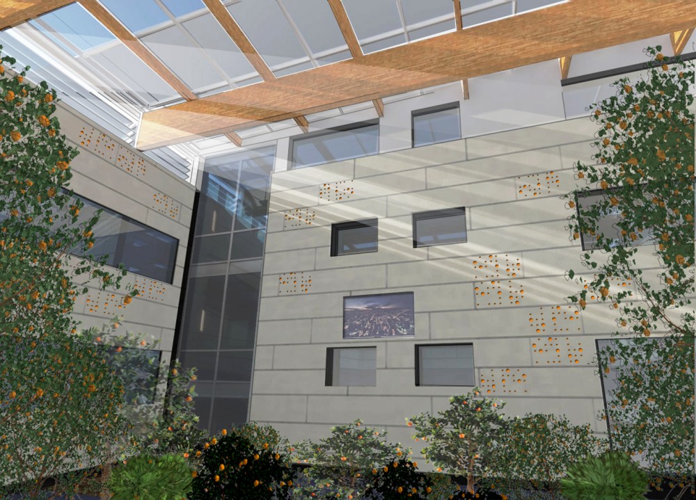 - Sustitución de un lucernario de cubrición de patio traslúcido, de bóvedas de policarbonato por otra cubierta formada por una lámina de módulos fotovoltaicos transparentes colocados en horizontal. Esta solución permite el paso de luz natural al patio a la vez que se genera energía limpia. Se sustituye la antigua estructura metálica de la cubierta por otra de madera laminada vista que aporta un aspecto de mayor calidez, teniendo en cuenta que el patio aloja un jardín interior.